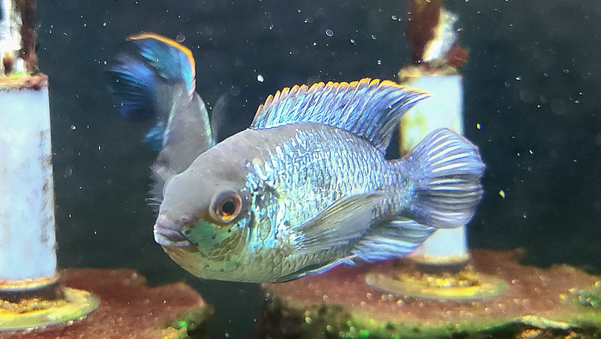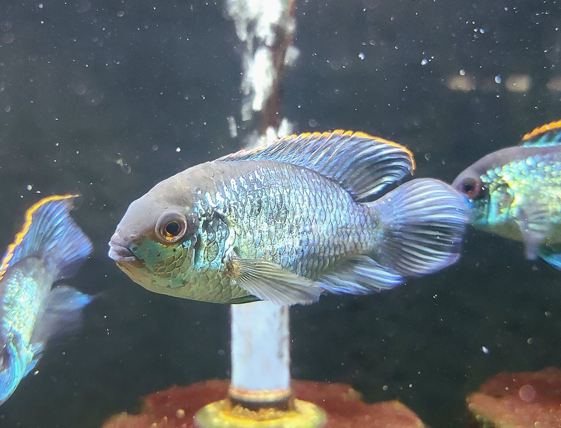 These are relatively peaceful cichlids that make ideal tank mates for angelfish. Even as juveniles they display a striking electric blue coloration. They will be 1.5" to 2" when shipped. Adult size is roughly 4"-5".